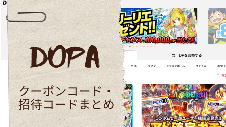 大手オンラインオリパ「DOPA」は、新規登録時の特典が超アツい! 新規登録時、クーポンコードを入力すれば最大800ptが無料でもらえる…?! 本記事では、無料でポイントがもらえるクーポンコードを掲載しています。具体的な使い方から使えないときの対処法、お得なキャンペーン情報までまるっとご紹介していきます! DOPAのクーポンコード・招待コード DOPAに初めて登録する方限定ですが、以下のクーポンコー […]