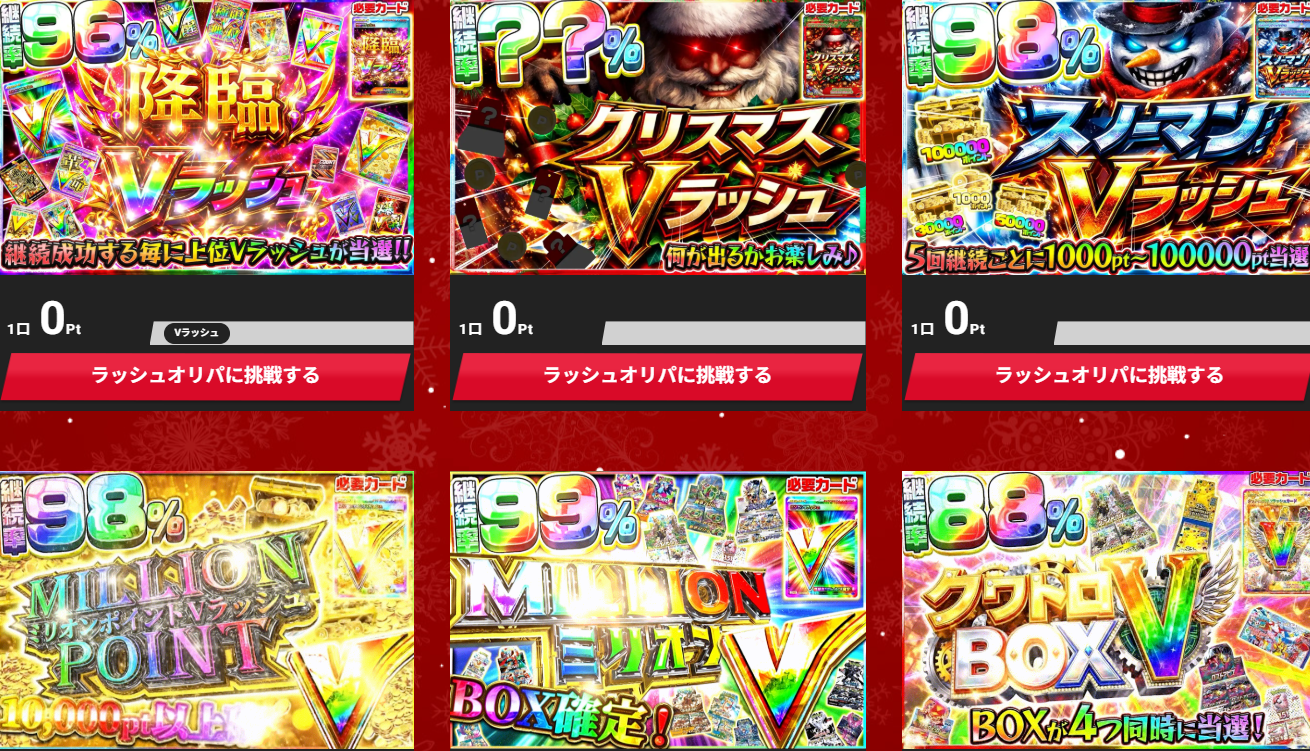 終了表示が出るまで引き続けられるVラッシュ、BOX大量・ポイント爆増という夢を掴める、そんなオリパサイトですから、むしろハマりすぎ注意レベル!
