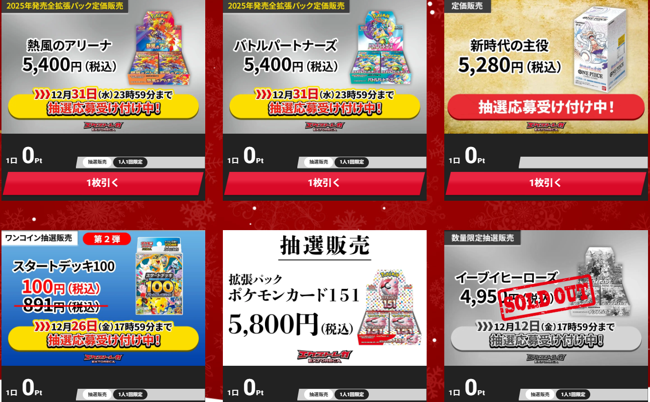 エクストレカでは、人気の絶版BOXや新弾BOXが定価、もしくは割引価格で販売されることがあります。