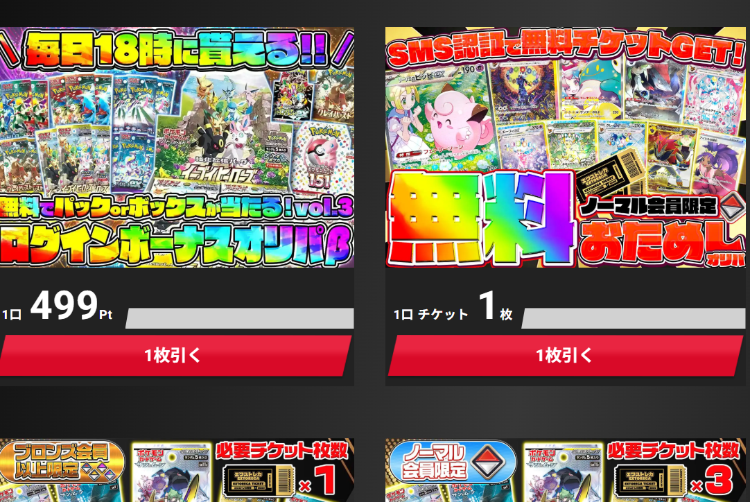 新規登録者向けに“無料チケット”が配布されるという仕組みがあり、初めてオリパを体験するユーザーにとって魅力的な環境が整えられています。