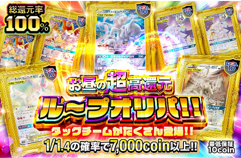 こちらも70%の確率でループできるオリパですが、最低保証が厚く、70%を引ければ1,100coin以上のアドがとれる設定。